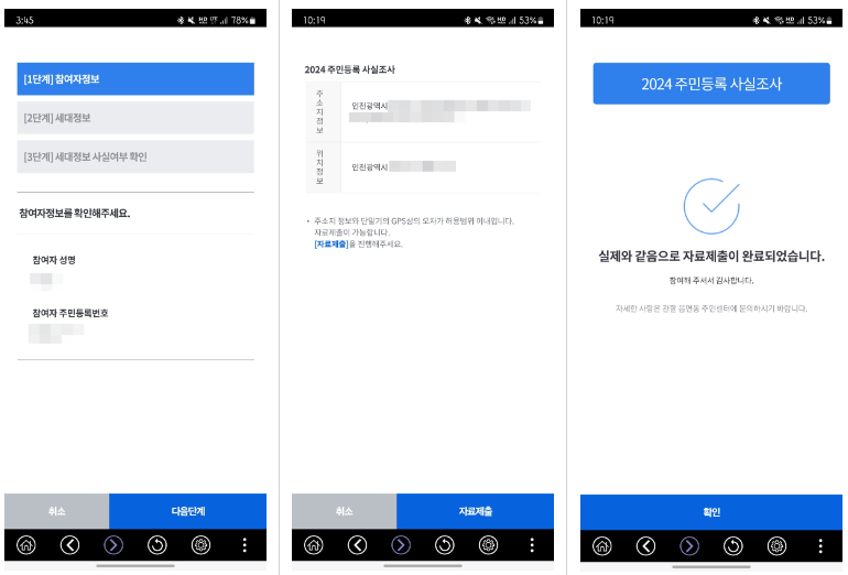 모든 정보를 정확히 입력한 후, 제출 버튼을 눌러 조사 내용을 전송하면 됩니다. 이 때 유의사항은 꼭 GPS 기능을 키고 주민등록상 주소지에서 진행해야 한다는 점 입니다.