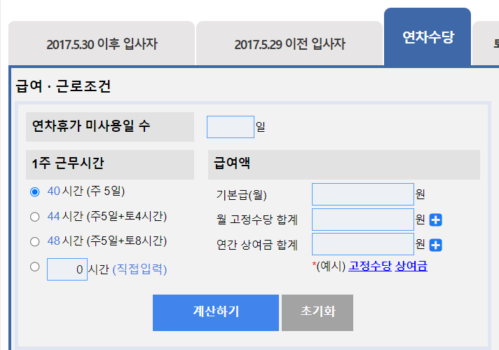 연차수당은 아래와 같이 생겼는데요, 연차수당을 계산하기 위해 미사용일 수 그리고 월 기본급을 입력해주니 바로 연차수당이 간편하게 계산되는 것을 확인할 수 있습니다.